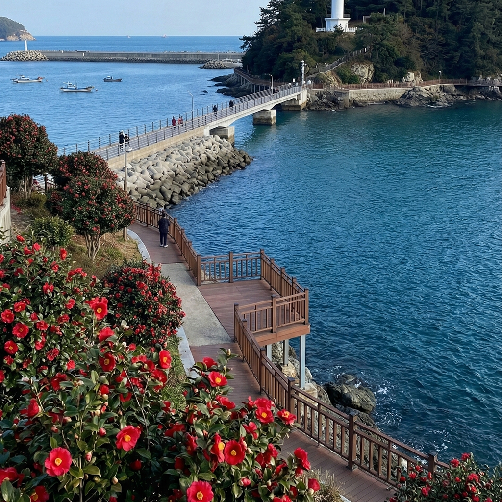 배를 든든히 채웠다면 바로 옆 오동도로 향합니다. 12월부터 꽃망울을 터뜨리기 시작하는 동백꽃이 섬 전체를 붉게 물들입니다. 시원한 바닷바람을 맞으며 동백꽃 길을 걷다 보면 여수의 낭만을 온몸으로 느낄 수 있습니다.