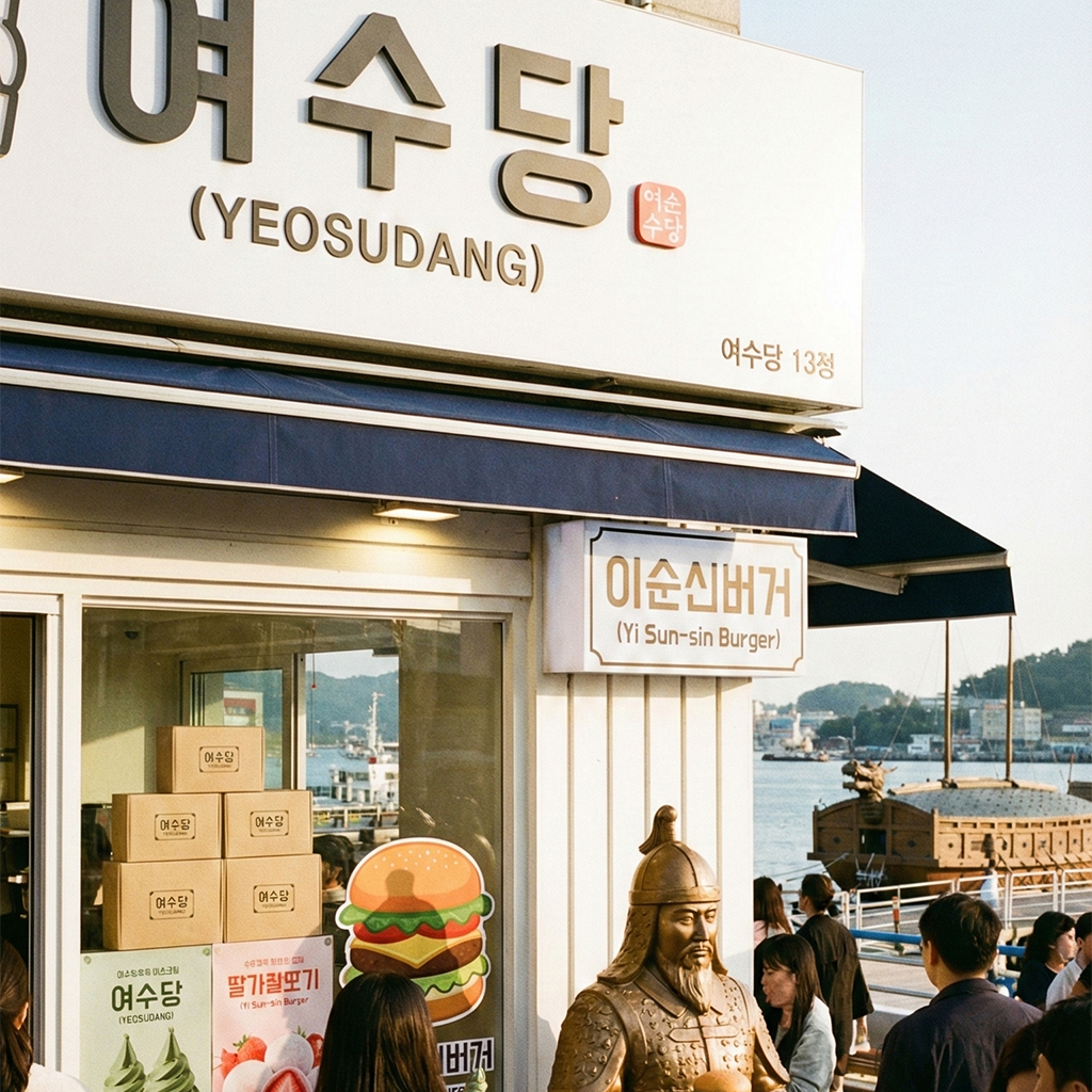 점심은 이순신광장 주변의 먹거리를 즐기는 시간입니다. 바삭한 바게트 안에 매콤한 속을 채운 여수당의 바게트버거와, 진한 쑥 향이 매력적인 쑥 아이스크림은 필수 코스입니다. 이순신 수제버거 역시 빼놓을 수 없는 별미입니다.