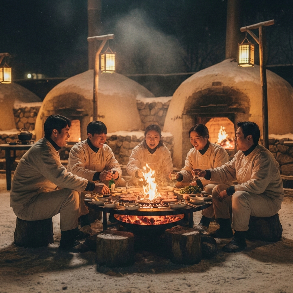 - 오후 6:00 | 참숯 바비큐 파티: 식당 중앙에 마련된 공용 숯불을 이용해 준비해온 고기와 소시지, 버섯 등을 구워 먹습니다. 숯불에 은박지로 감싼 고구마나 감자를 구워 먹는 것은 겨울 여행의 백미입니다.