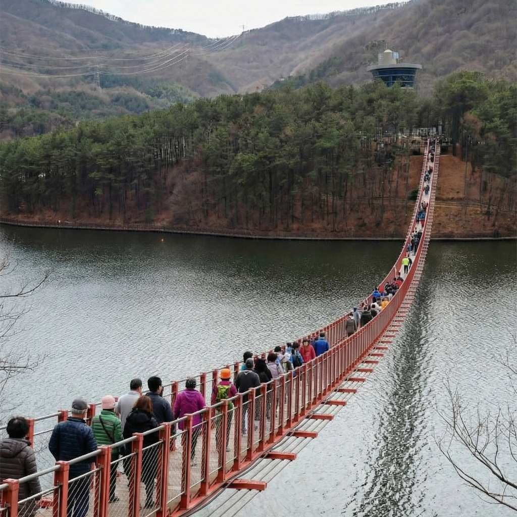 참숯가마에서 차로 약 15~20분 거리에 있는 마장호수를 방문합니다. 총 길이 220m의 아찔한 출렁다리를 건너고, 3.6km의 수변 둘레길을 산책하며 겨울 호수의 고즈넉한 풍경을 만끽합니다.