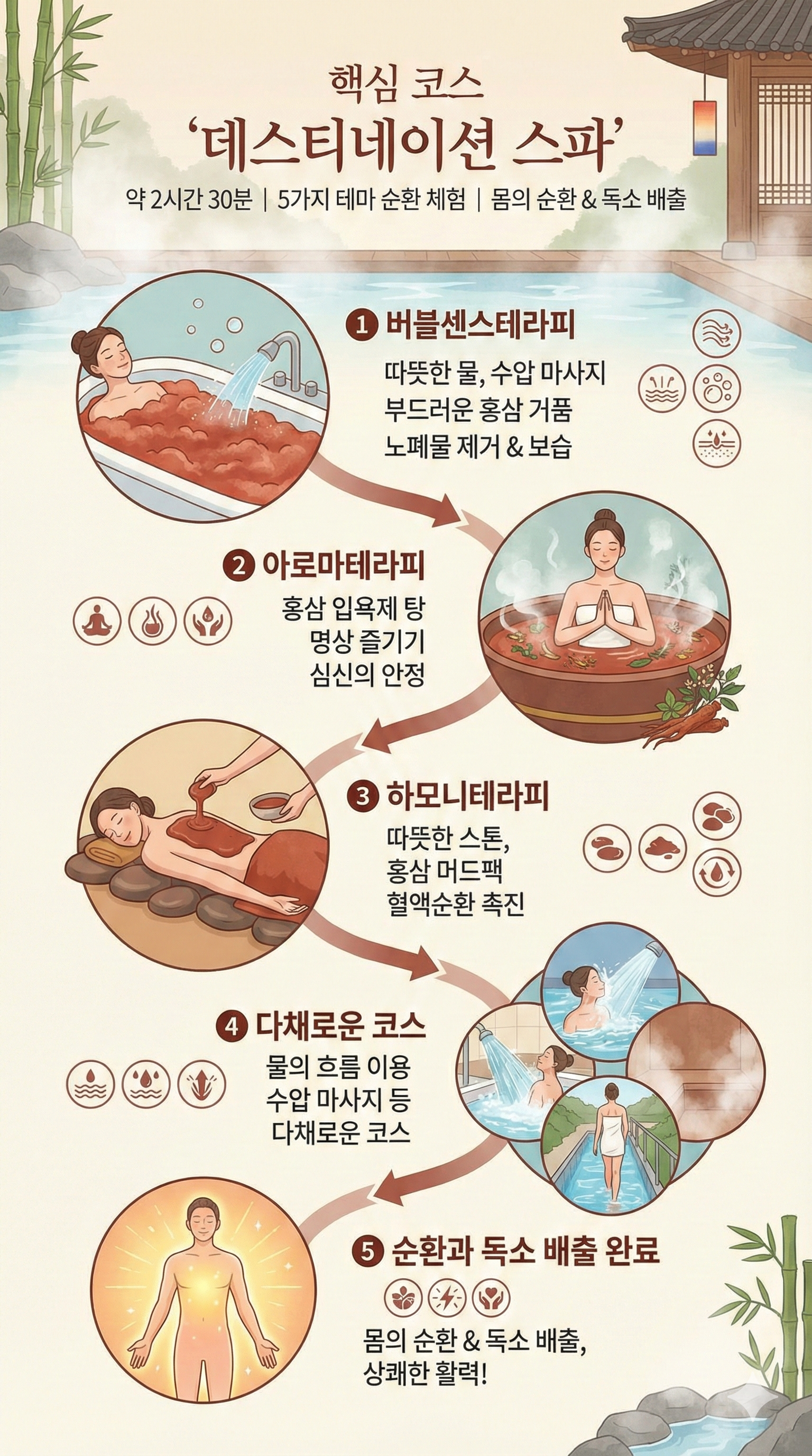 약 2시간 30분 동안 5가지 테마의 스파를 순서대로 체험하며 몸의 순환을 돕고 독소를 배출하는 프로그램입니다.