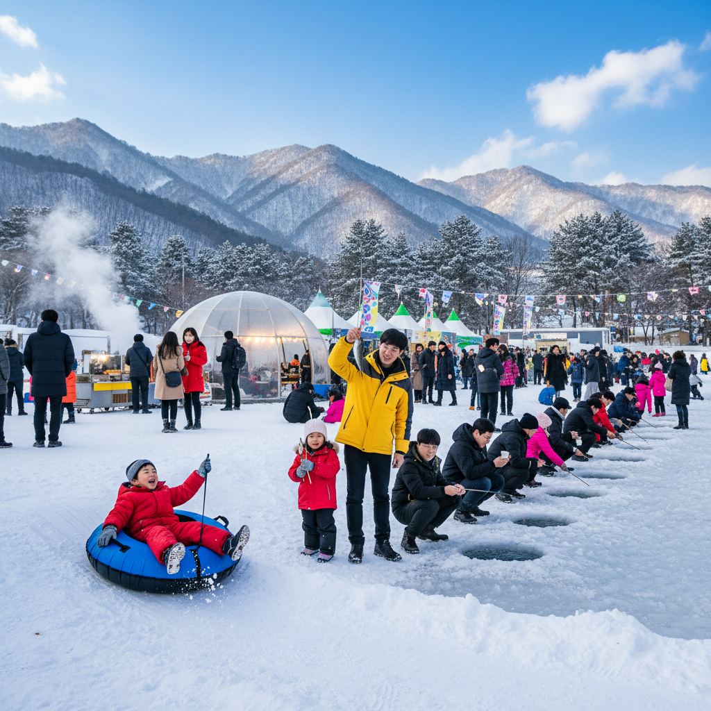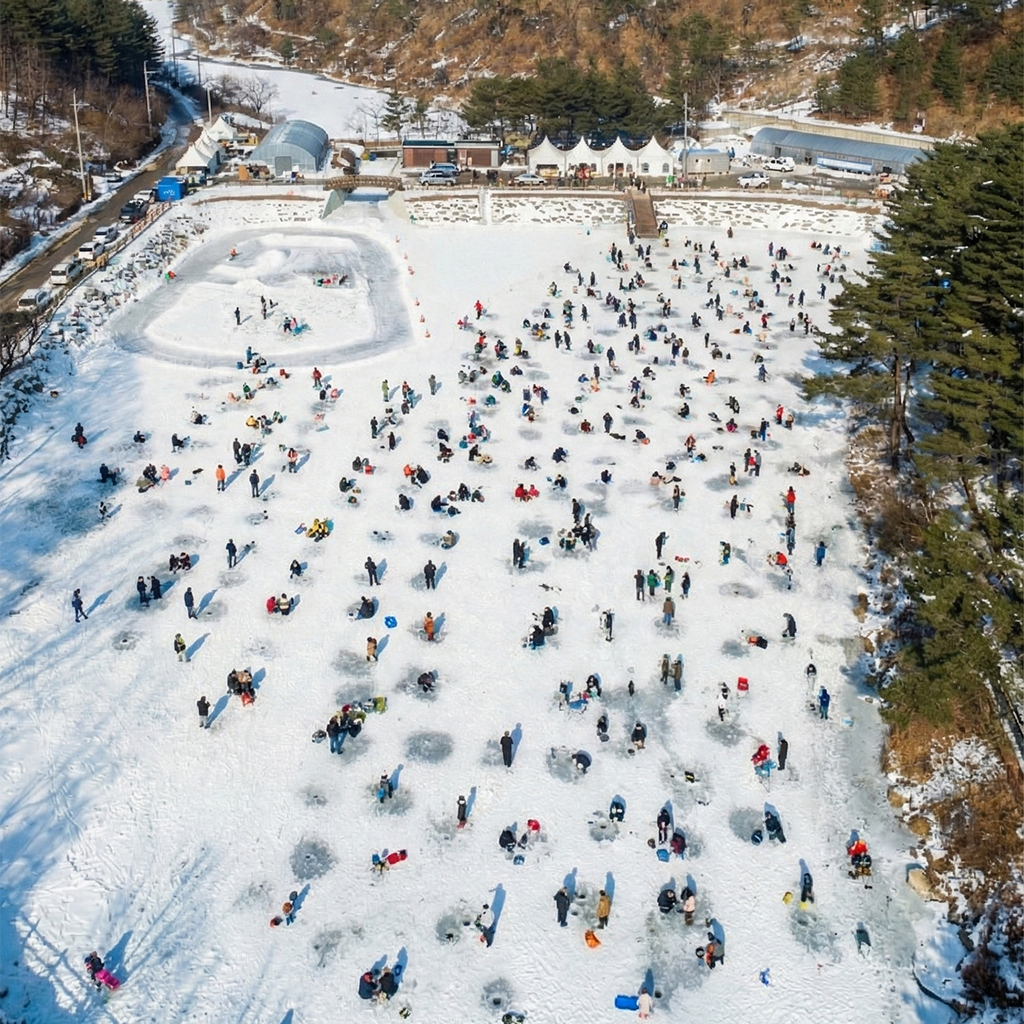 서울에서 약 1시간 30분 거리에 위치한 양평 수미마을에서 열리는 빙송어 축제는 뛰어난 접근성과 농촌 체험을 결합한 가족 맞춤형 축제입니다.