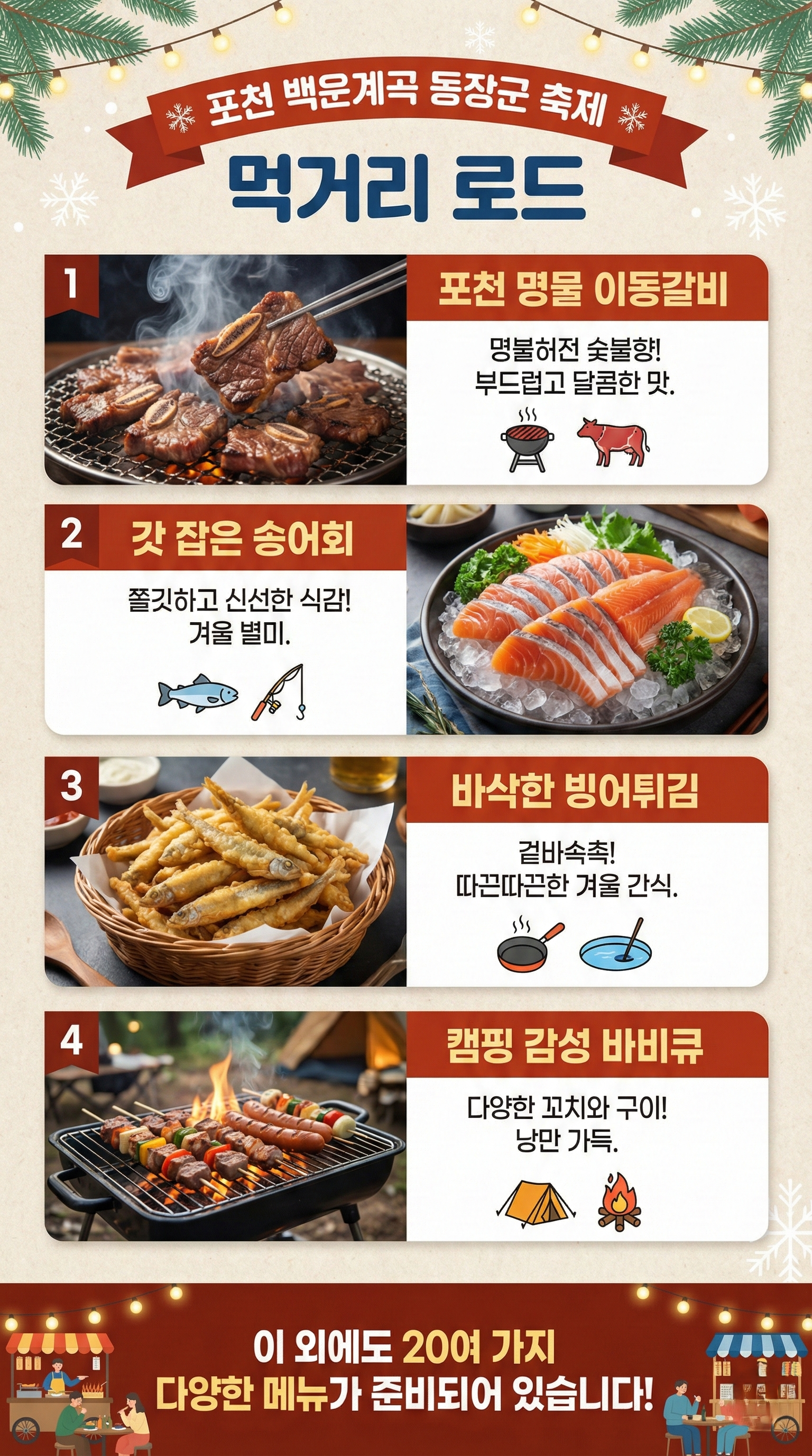 축제의 또 다른 즐거움은 바로 먹거리입니다. 포천의 명물 이동갈비를 필두로 갓 잡은 송어회, 바삭한 빙어튀김, 캠핑 감성의 바비큐까지 20여 가지가 넘는 메뉴가 준비되어 있어 미식 여행으로도 손색이 없습니다.