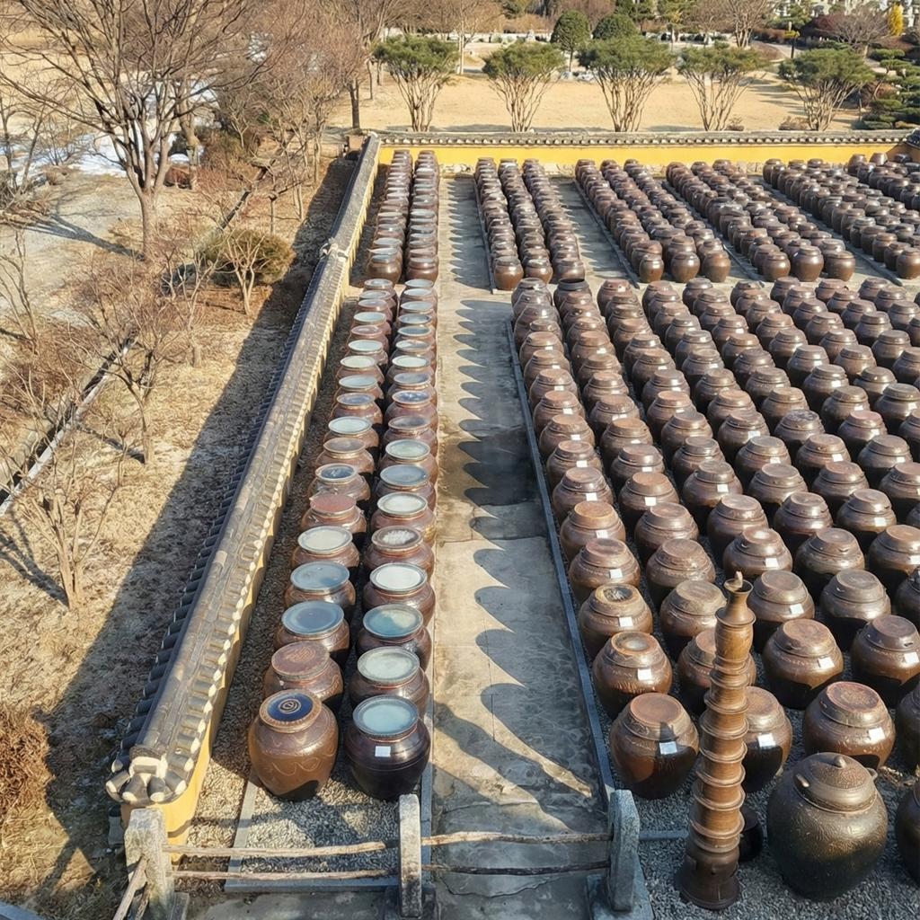 여행의 대미를 장식할 곳은 전통 장(醬)이 익어가는 공간, '고스락'입니다. 4,000여 개가 넘는 전통 장독대가 질서정연하게 늘어선 풍경은 그야말로 장관입니다.