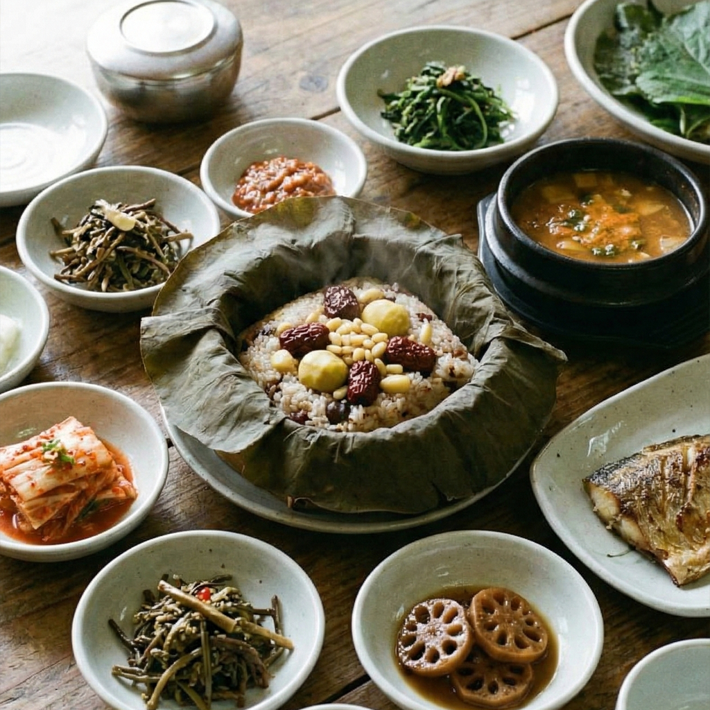부여에서의 저녁은 백제의 건강함을 담은 '연잎밥 정식'을 추천합니다. 은은한 연잎 향이 밴 찰밥과 함께 정갈하게 차려진 다양한 반찬들은 눈과 입을 동시에 만족시킵니다. 자극적이지 않고 재료 본연의 맛을 살린 백제의 밥상은 그 자체로 훌륭한 힐링입니다.