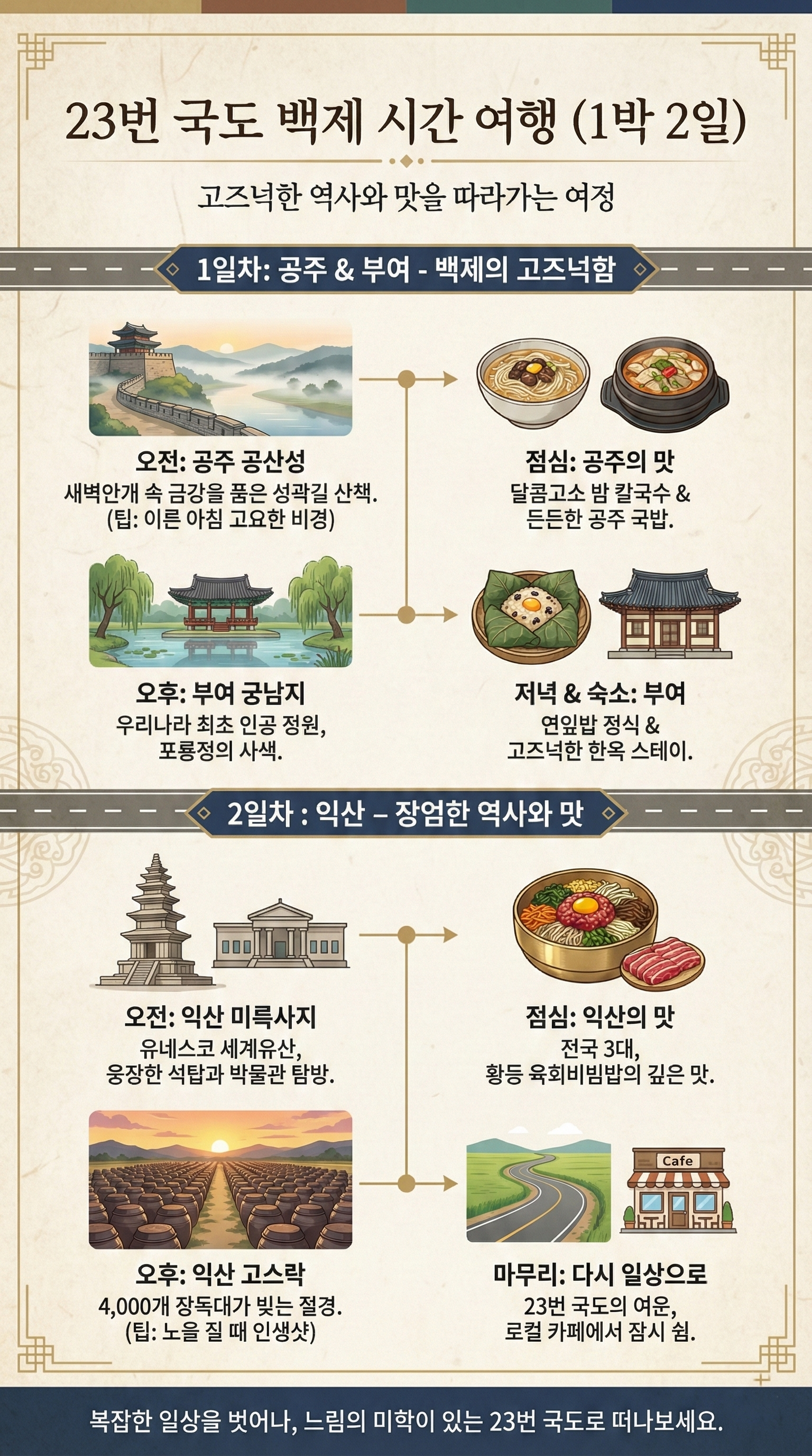 오늘은 백제의 옛 수도였던 공주, 부여, 그리고 익산을 잇는 23번 국도를 따라 떠나는 1박 2일 역사 미식 여행을 제안합니다.