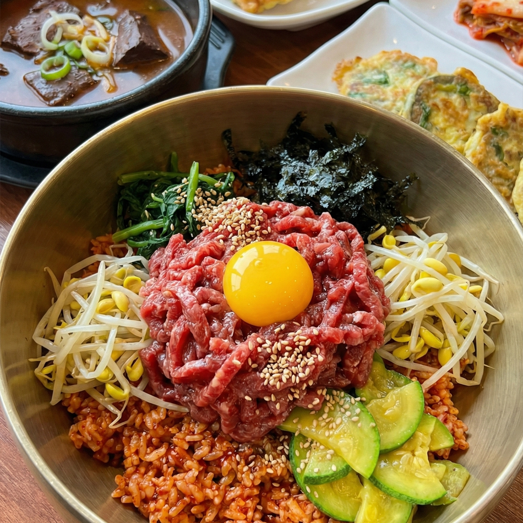 숟가락으로 슥슥 비벼 한입 가득 넣으면, 고소한 참기름 향과 육회의 부드러움, 그리고 아삭한 채소의 식감이 어우러져 감탄을 자아냅니다. 함께 나오는 선짓국과의 조화도 일품입니다.