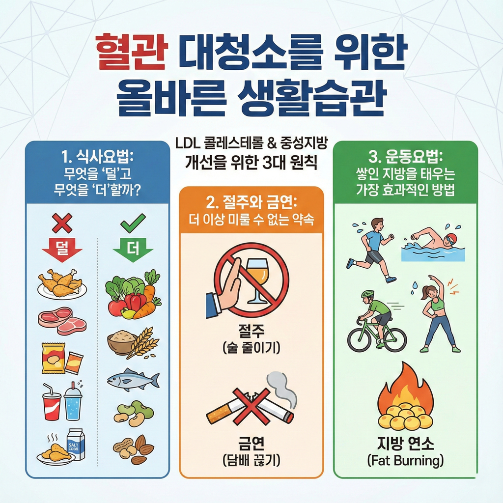 LDL 콜레스테롤과 중성지방 수치를 개선하기 위해서는 식단 조절, 운동, 금연 및 절주라는 3대 원칙을 반드시 지켜야 합니다.