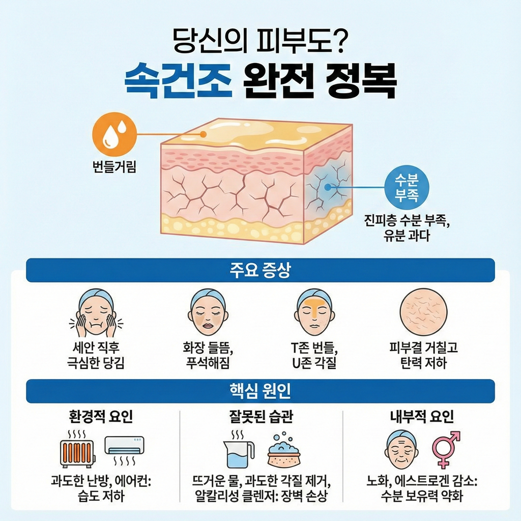 겉은 유분으로 번들거리지만 속은 메마른 듯 당기는 느낌, 바로 '속건조'의 대표적인 신호입니다. 단순히 피부가 건조한 것과는 근본적으로 다른 이 문제적 피부 상태는 계절을 불문하고 많은 이들의 고민거리입니다.