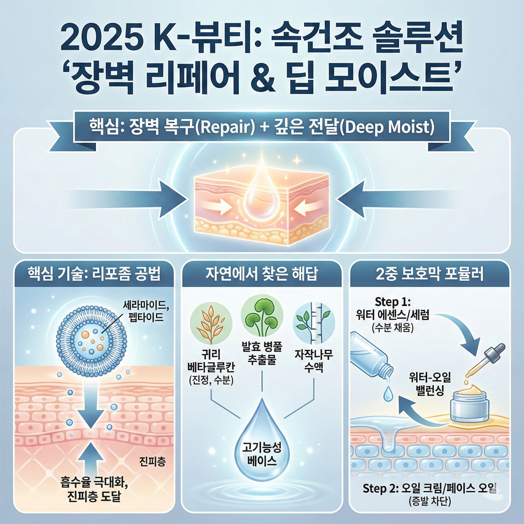2025년 K-뷰티 시장의 화두는 단순히 수분을 '공급'하는 것을 넘어, 피부 장벽을 근본적으로 '복구(Repair)'하고 유효 성분을 피부 깊숙이 '전달(Deep Moist)'하는 것에 초점이 맞춰져 있습니다.