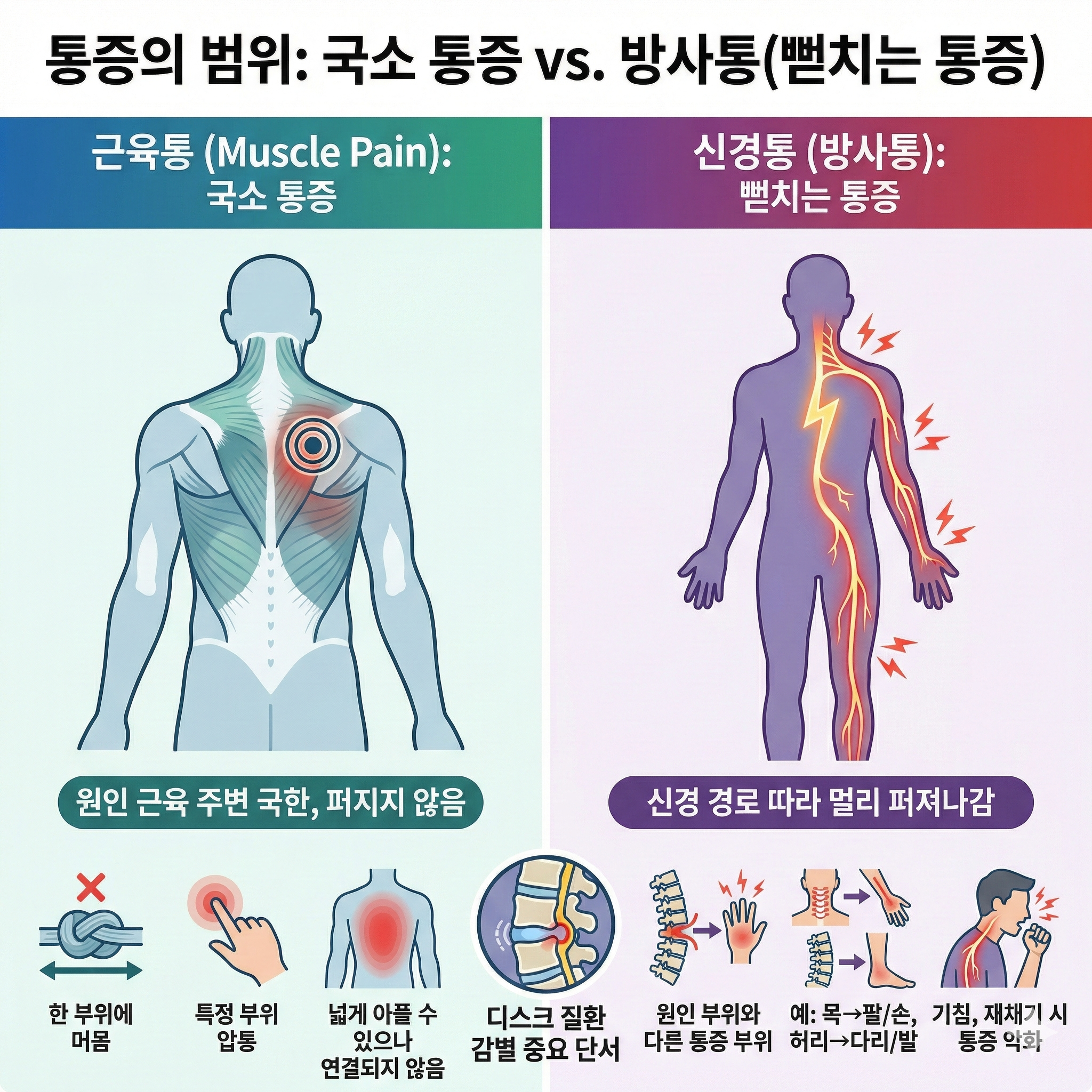 2. 통증의 '범위': 국소 통증 vs 방사통(뻗치는 통증)