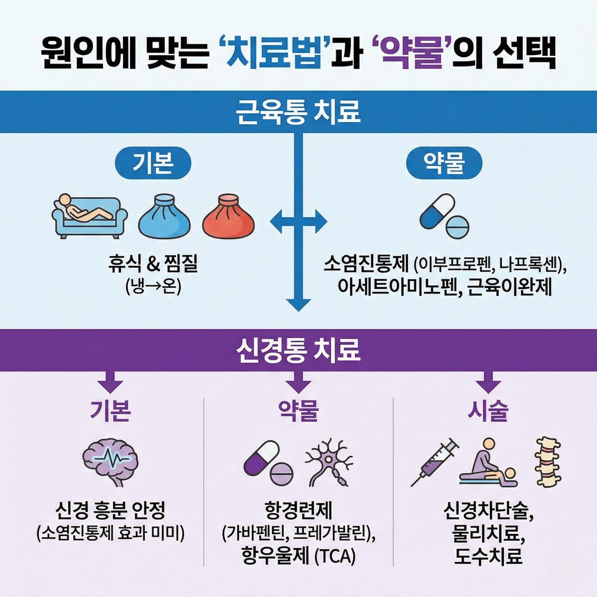 - 기본: 일반적인 소염진통제만으로는 효과가 미미한 경우가 많습니다. 신경 자체의 비정상적인 흥분 상태를 안정시키는 것이 치료의 핵심입니다.