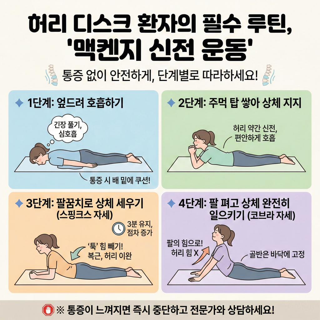 - 맥켄지 운동은 단계별로 안전하게! 통증 없는 범위에서 엎드려 이완하는 1단계부터 차근차근 시작하세요.