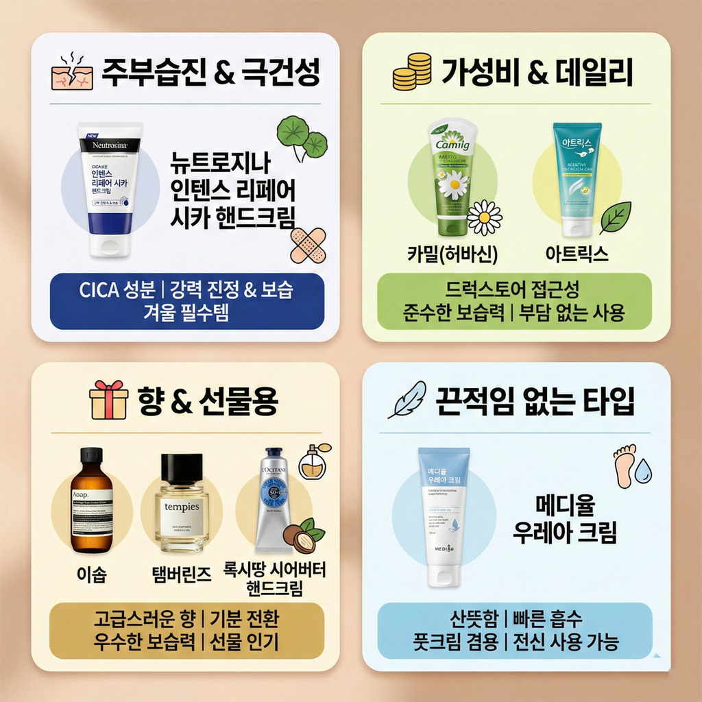 - 주부습진 & 극건성: 뉴트로지나 인텐스 리페어 시카 핸드크림. 상처 치유에 효과적인 시카(CICA) 성분이 함유되어 진정 효과가 뛰어나며, 강력한 보습력과 합리적인 가격으로 겨울철 필수 아이템입니다.
