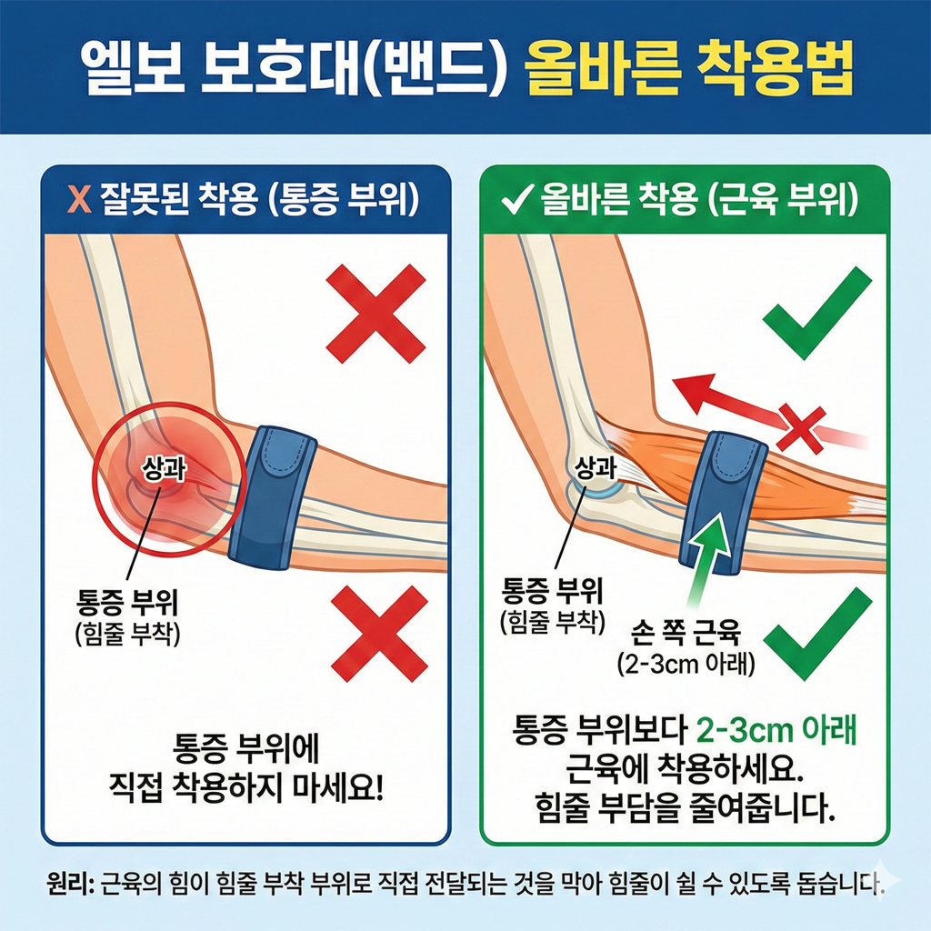 보호대는 통증 부위에 직접 착용하는 것이 아닙니다. 통증이 느껴지는 팔꿈치 뼈(상과)보다 약 2~3cm 아래, 즉 손 쪽 방향의 근육 부위에 착용해야 합니다.