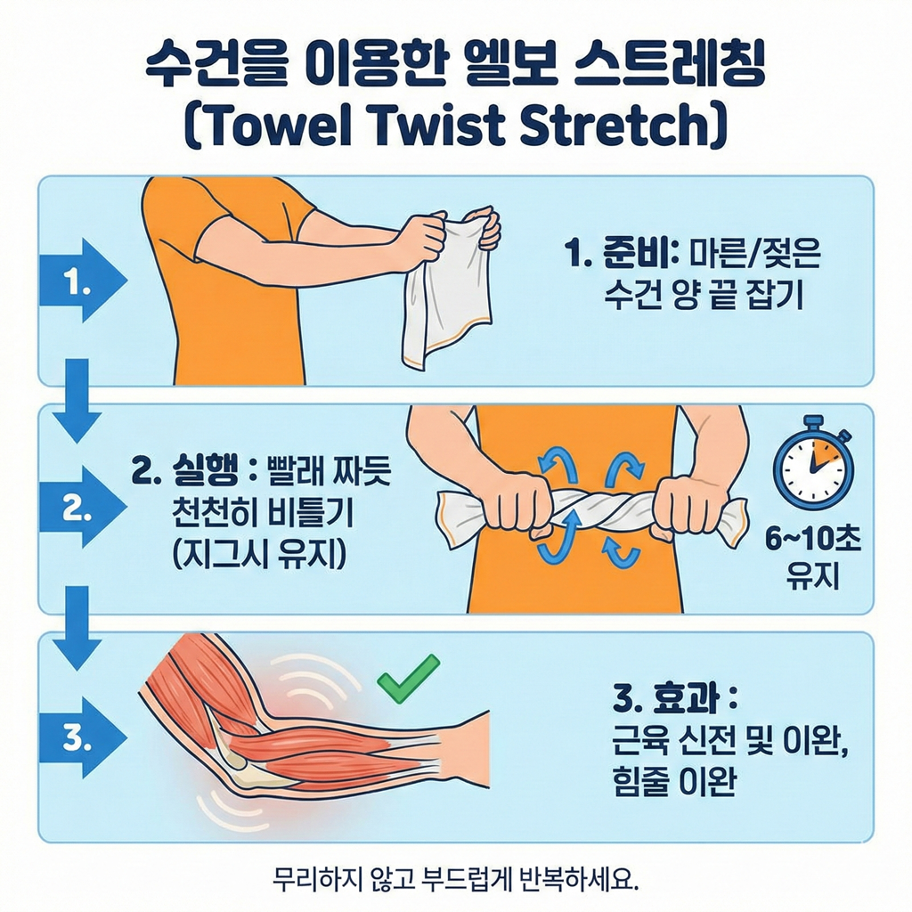 이후 빨래를 짜듯이 손목을 천천히 비틀어 줍니다. 강하게 한 번에 비트는 것이 아니라, 지그시 힘을 주며 6~10초간 유지하는 동작을 반복하면 근육의 신전과 이완에 도움이 됩니다.
