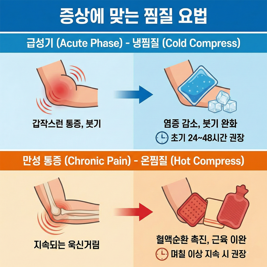 통증이 갑자기 심해지고 붓기가 있는 급성기에는 냉찜질을 하여 염증 반응을 가라앉히는 것이 좋습니다. 반면, 며칠 이상 지속되는 욱신거리는 만성 통증에는 온찜질을 통해 혈액순환을 촉진하고 근육을 이완시키는 것이 효과적입니다.