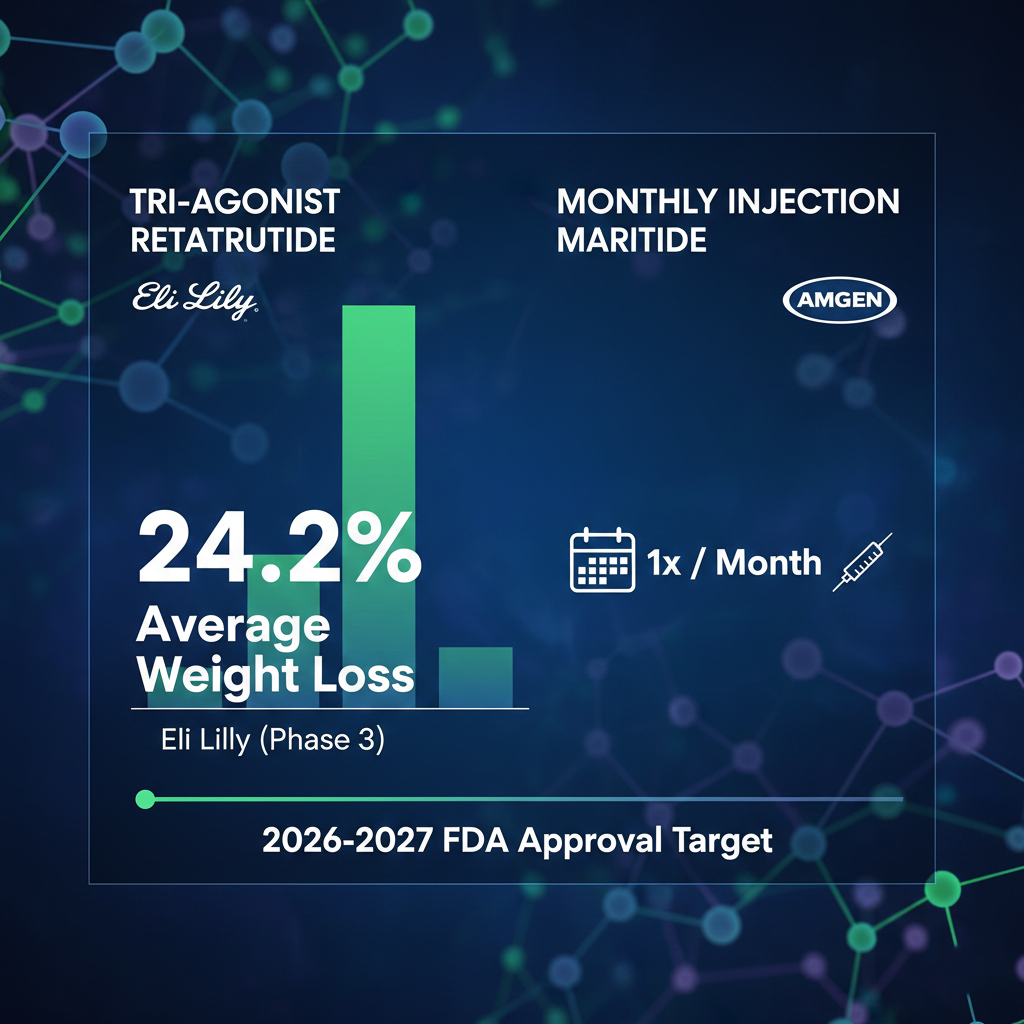 일라이 릴리가 개발 중인 이 약물은 GLP-1, GIP, 글루카곤 수용체를 동시에 활성화합니다. 임상 2상에서 무려 **24.2%**라는 경이적인 평균 체중 감량률을 기록하며, 비만 대사 수술에 버금가는 효과를 예고해 시장에 큰 충격을 주었습니다.