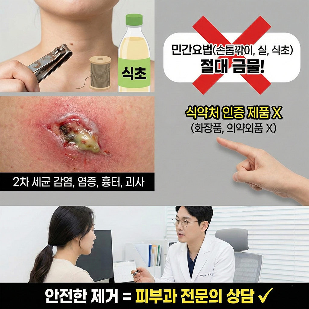손톱깎이나 실, 식초 등을 이용한 민간요법은 매우 위험합니다. 소독되지 않은 도구는 2차 세균 감염을 일으켜 염증을 유발할 수 있으며, 잘못 제거할 경우 깊은 흉터나 색소침착을 남길 수 있습니다.