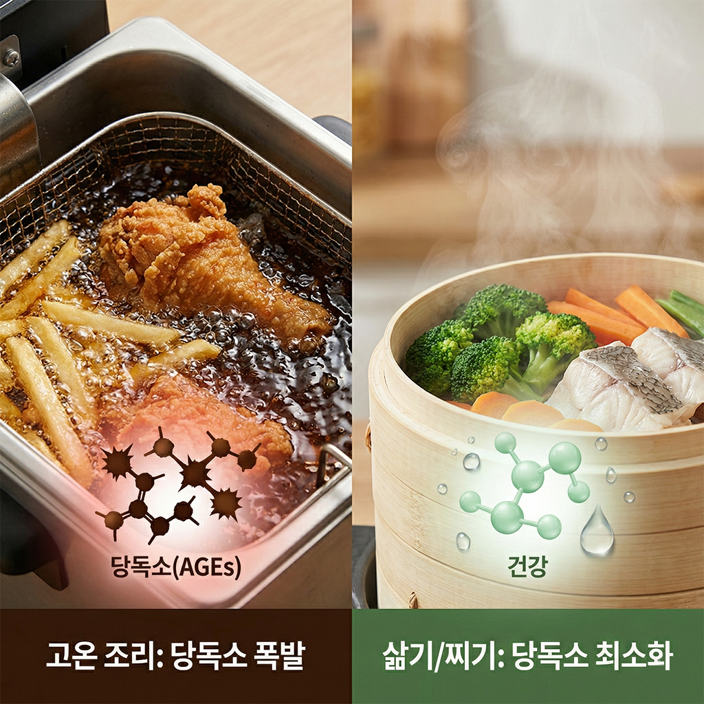 마지막으로 주목해야 할 것은 '당독소(최종당화산물, AGEs)'입니다. 당독소는 단백질이나 지방이 고온의 조리 과정에서 당과 결합하여 생성되는 변성 물질로, 우리 몸에 염증을 유발하고 노화를 촉진하는 주범으로 꼽힙니다.