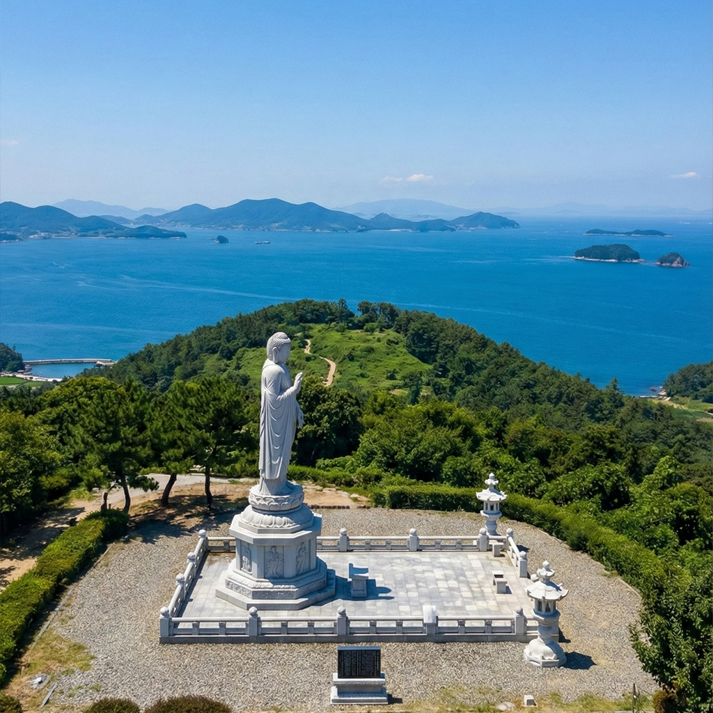 거대한 아미타대불이 인자한 미소로 여행객을 맞이하며, 이곳 전망대에서는 욕지도, 비진도, 소매물도 등 통영의 보석 같은 섬들이 파노라마처럼 펼쳐집니다.