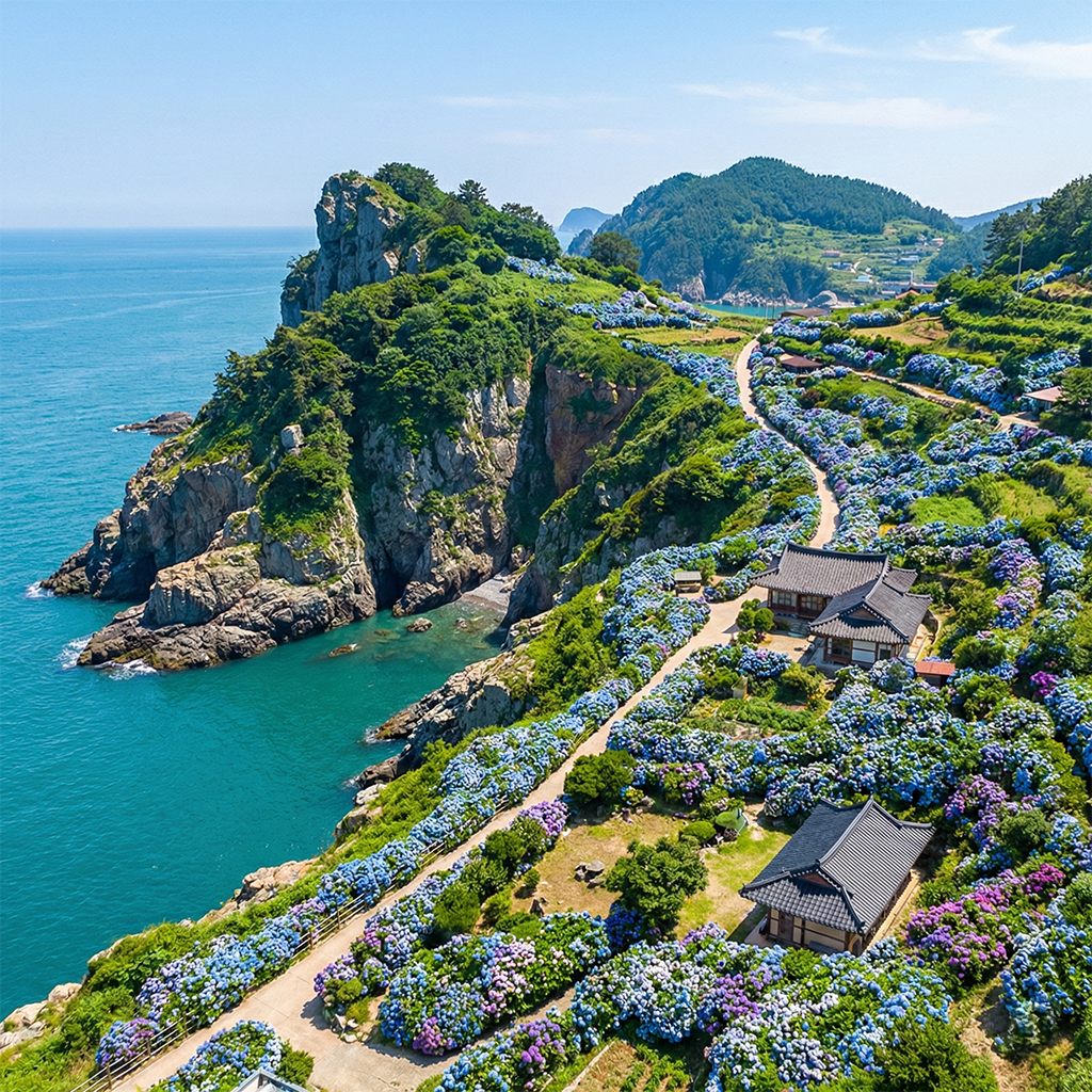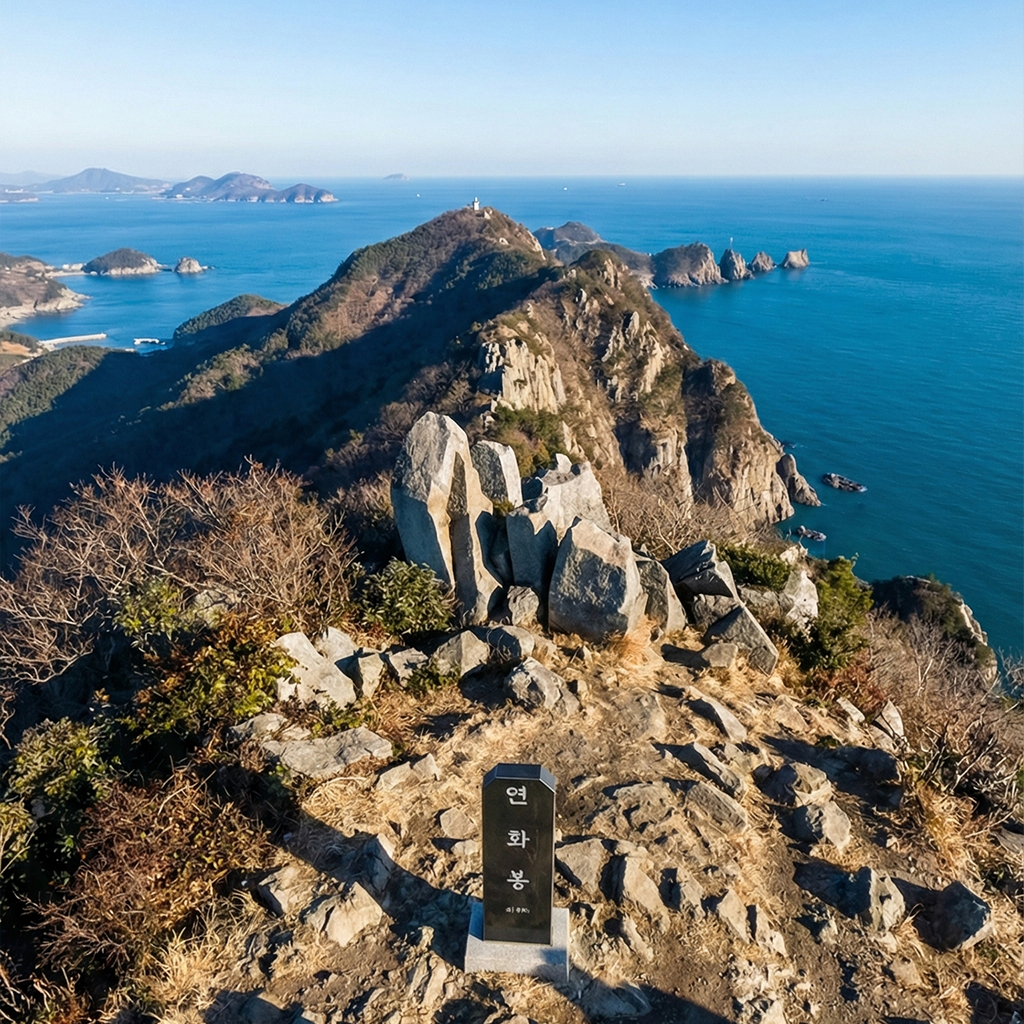 바로 '바다에 핀 연꽃'이라는 아름다운 이름을 가진 **연화도(蓮花島)**입니다. 통영 8경 중 하나인 '용머리 해안'의 압도적인 비경을 품고 있으며, 6~7월이면 만개하는 수국으로 섬 전체가 푸르게 물드는 환상적인 곳입니다.