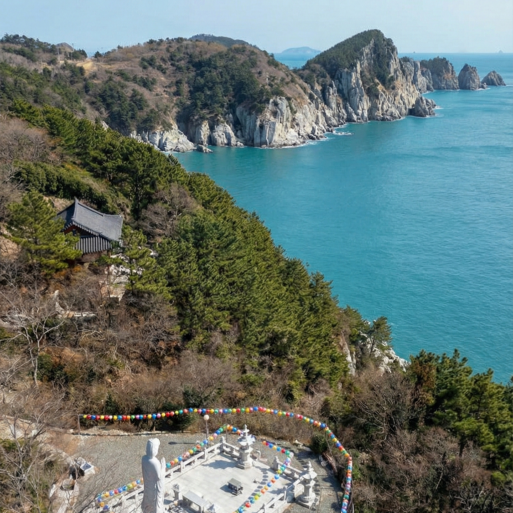 이곳은 연화도 최고의 인생 사진 명소로, 해수관음상과 푸른 바다, 그리고 용머리 해안이 한 프레임에 담기는 풍경이 압권입니다.