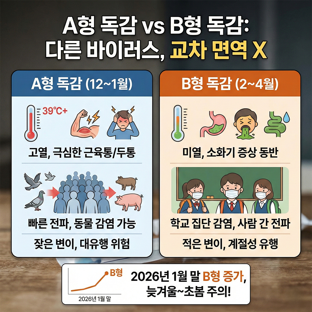 | 구분 | A형 독감 (주로 12~1월 유행) | B형 독감 (주로 2~4월 유행) |