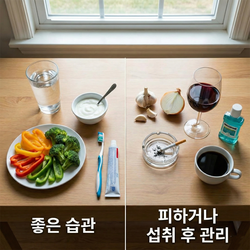 마늘, 양파, 술, 담배, 커피 등은 구강을 건조하게 하거나 그 성분이 혈액에 흡수되어 폐를 통해 냄새를 유발하므로 섭취 후에는 반드시 구강 관리를 철저히 해야 합니다.