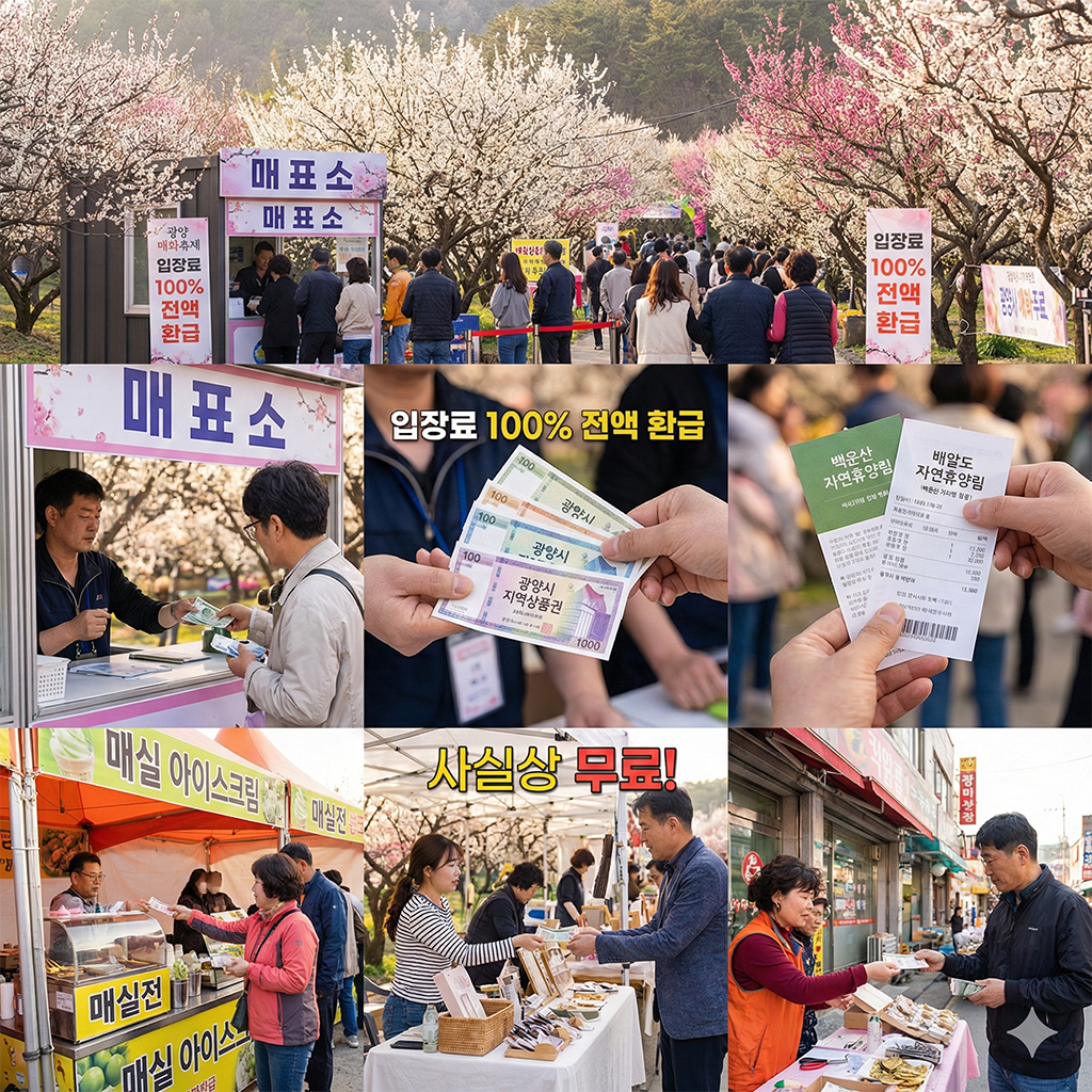 축제 기간 동안 유료(5,000원~6,000원 선)로 운영되지만, 지불한 입장료 전액을 축제장 및 광양시 지정 상점에서 현금처럼 사용할 수 있는 '광양시 지역상품권'으로 돌려받을 수 있습니다.