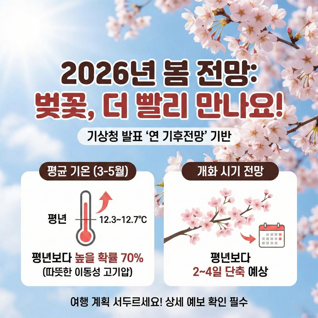 성공적인 벚꽃 여행의 첫걸음은 날씨를 파악하는 것입니다. 기상청이 발표한 **'2026년 연 기후전망'**에 따르면, 올해 봄은 평년보다 따뜻한 날씨가 이어질 확률이 높습니다.