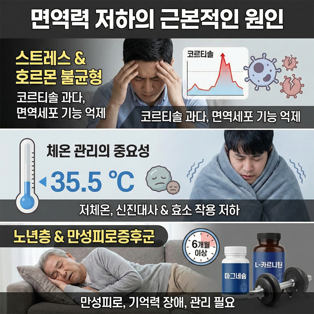 그렇다면 우리의 면역력은 왜 약해지는 것일까요? 스트레스와 체온, 만성 피로의 관계를 통해 그 원인을 알아보겠습니다.
