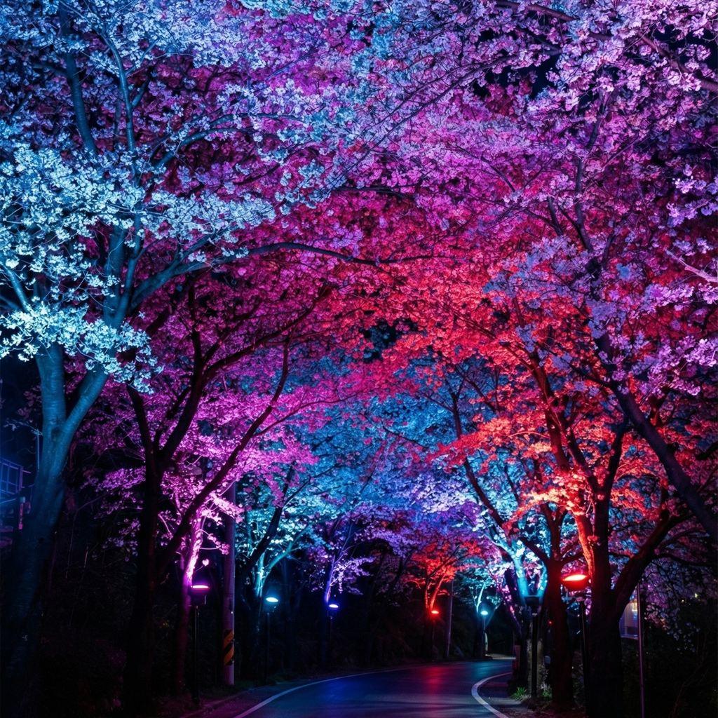하동군은 벚꽃 시즌 동안 매일 일몰부터 자정까지 십리벚꽃길 주요 구간에 다채로운 색상의 경관 조명을 점등합니다.