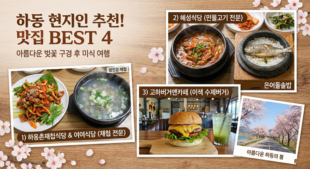 아름다운 벚꽃 구경 후에는 하동의 신선한 식재료로 만든 맛있는 음식이 여행의 만족도를 높여줍니다. 광고가 아닌 현지인과 여행객들에게 꾸준히 사랑받는 맛집 네 곳을 엄선했습니다.