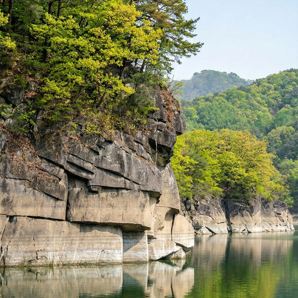 옥천 9경 중 3경에 해당하는 부소담악은 단순한 바위 절벽이 아닙니다. 이곳은 대청호의 물줄기와 어우러져 한 폭의 동양화를 연상시키는 700m 길이의 장대한 기암절벽입니다.