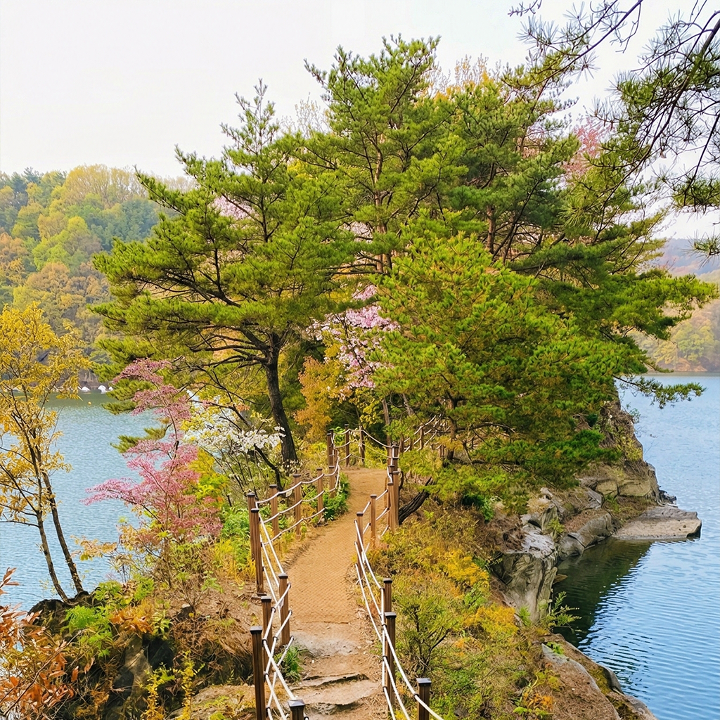 이곳에서는 마치 용이 호수 위를 미끄러지듯 유려하게 굽이치는 부소담악의 상징적인 S라인 절경을 한눈에 담을 수 있습니다. 가벼운 산책을 원하시는 분들께 최적의 코스입니다.