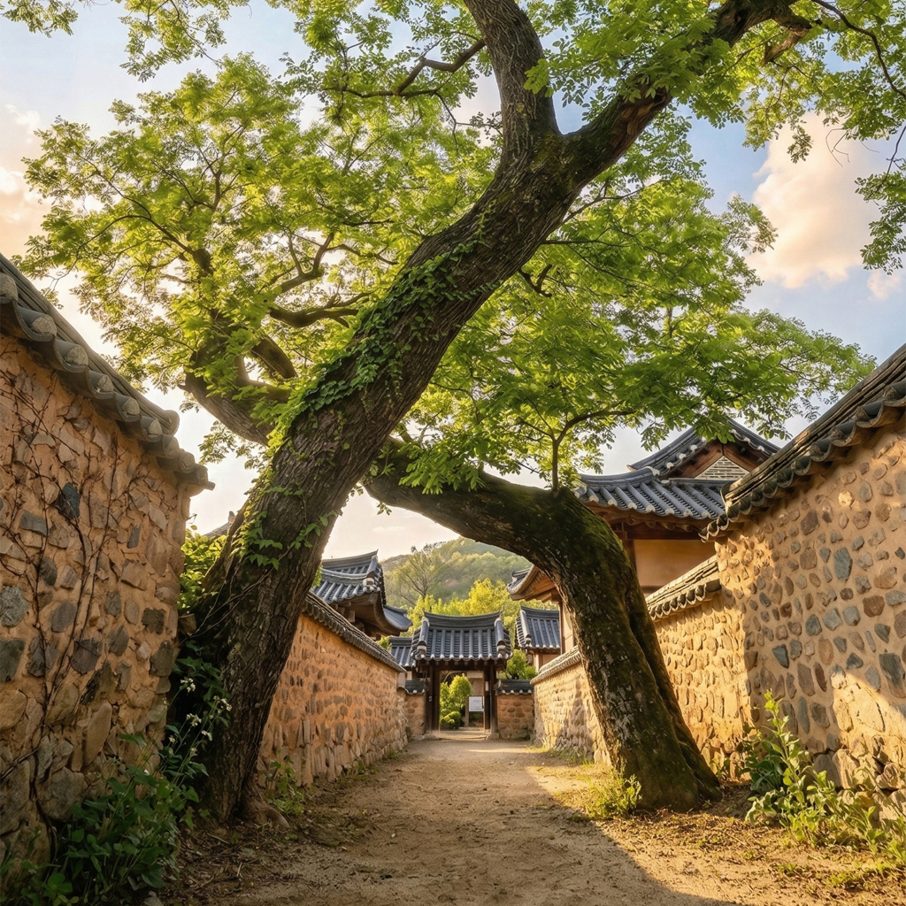 바로 X자 형태로 교차하며 서로를 감싸 안은 듯한 모습의 '부부 회화나무'입니다. 약 320년의 세월을 함께한 이 나무는 남사예담촌의 상징이자 최고의 포토 스팟입니다.