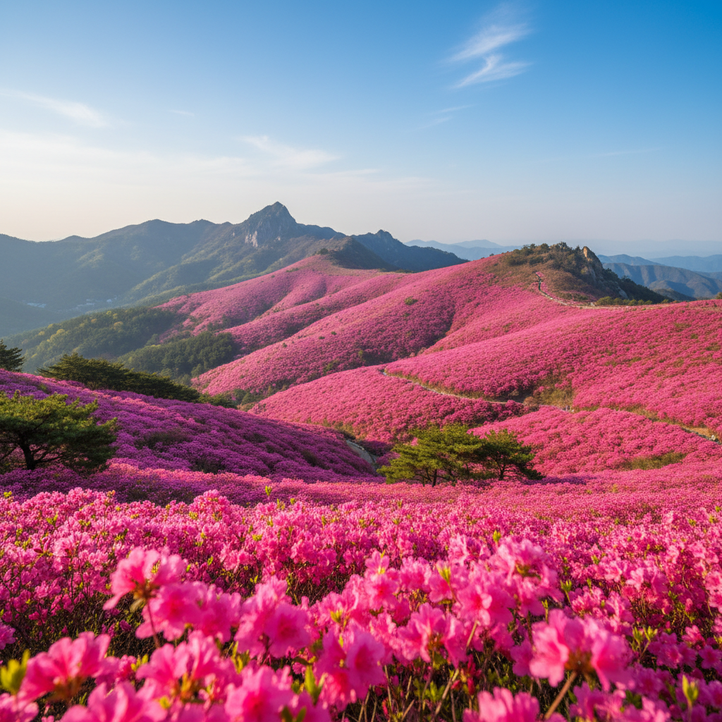 - 핵심 포인트: 능선을 따라 펼쳐지는 진달래 군락이 파노라마처럼 펼쳐져 '꽃바다'라는 표현이 실감 납니다.