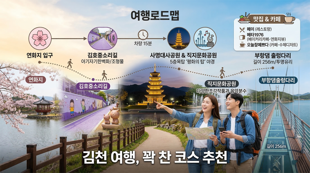 - 사명대사공원 & 직지문화공원 (차량 15분): 아름다운 5층 목탑 '평화의 탑' 야경이 유명하며, 다양한 조각 작품과 음악 분수를 즐길 수 있어 가족 나들이 코스로도 손색없습니다.