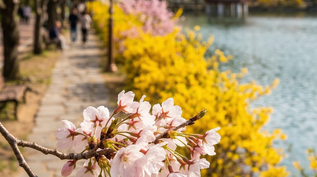 산책로 한편에는 노란 개나리와 연분홍 벚꽃이 조화를 이루는 구간이 있습니다. 특히 낮 시간대에 방문한다면, 화사한 색감의 대비가 돋보이는 아름다운 봄 사진을 촬영할 수 있습니다.