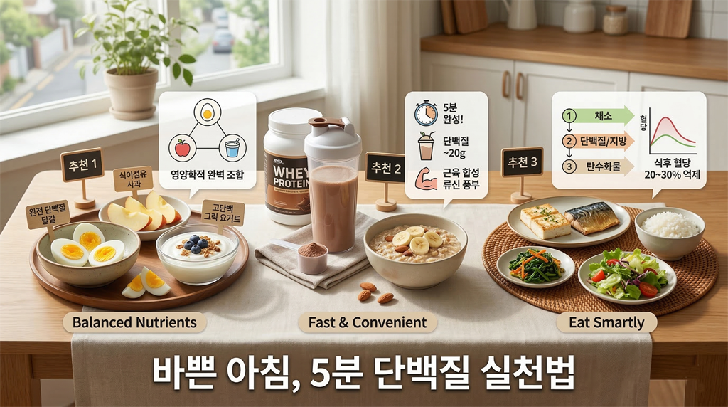 아무리 중요성을 알아도 실천이 어렵다면 무용지물입니다. 최소한의 시간으로 최대의 효과를 낼 수 있는 아침 단백질 식단 조합을 소개합니다.