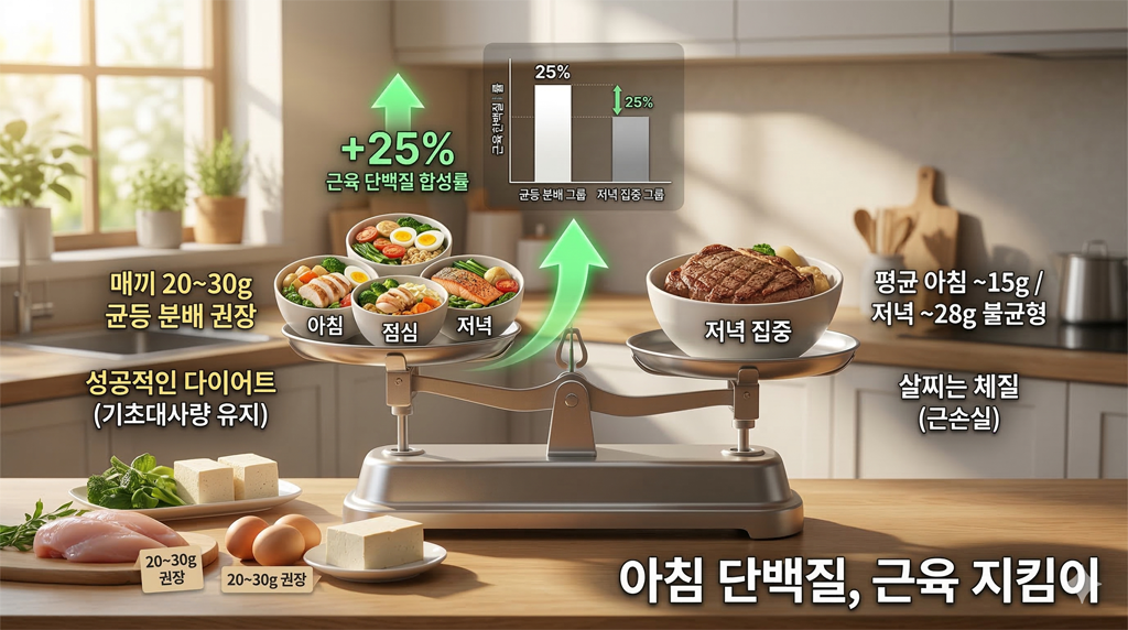 다이어트 시 근육량 감소는 기초대사량 저하로 이어져 결국 '살이 잘 찌는 체질'로 변하게 만듭니다. 아침 단백질 섭취는 근손실을 최소화하고 기초대사량을 유지하여 장기적으로 성공적인 다이어트를 이끄는 핵심 전략입니다.