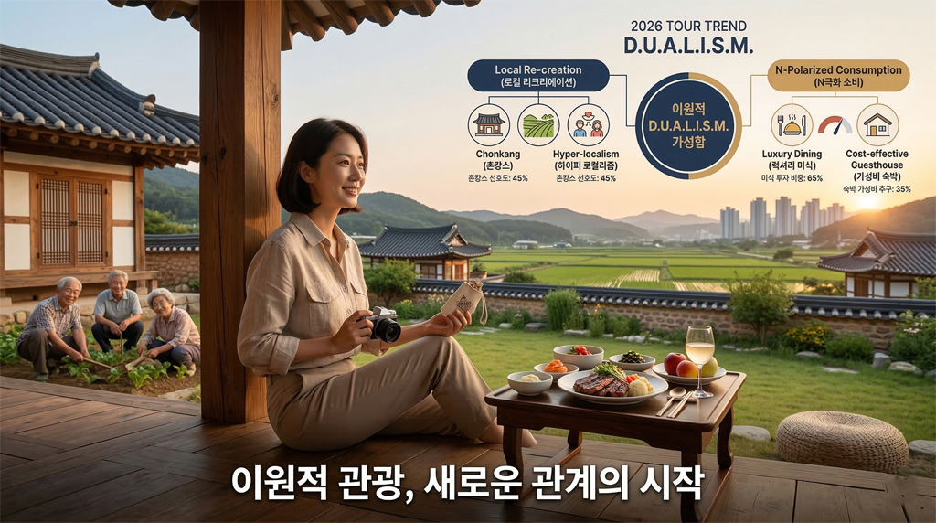 한국관광공사가 제시한 2026년 관광 트렌드의 핵심은 **'D.U.A.L.I.S.M.(이원적 관광시대)'**입니다. 이는 다양한 가치가 공존하는 여행 시대를 의미하며, 그중에서도 두 가지 흐름이 두드러집니다.