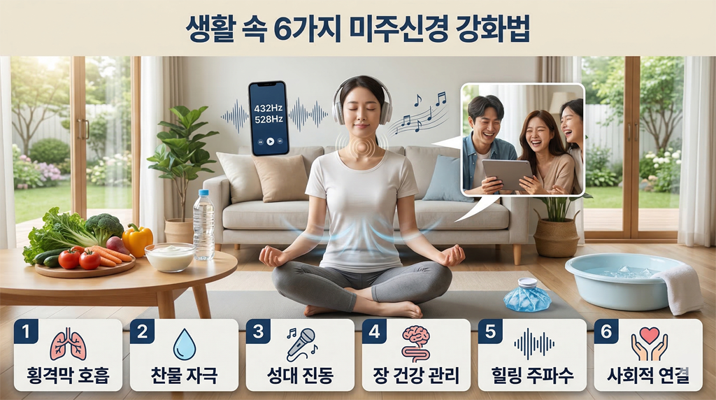 - 방법: 좋아하는 노래를 흥얼거리거나 소리 내어 부르고, '음~' 소리를 내는 허밍을 해보세요. 깊은 소리를 내는 '옴(OM)' 만트라를 외우거나, 물로 목 깊은 곳을 가글링하는 것도 미주신경 자극에 도움이 됩니다.