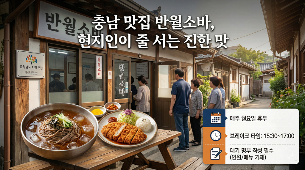 진한 육수가 일품인 **메밀소바(9,000원)**와 옛날식 **매콤돈까스(12,000원)**의 조합을 가장 추천합니다. 푸짐한 양과 뛰어난 맛으로 긴 웨이팅을 감수할 가치가 충분합니다.