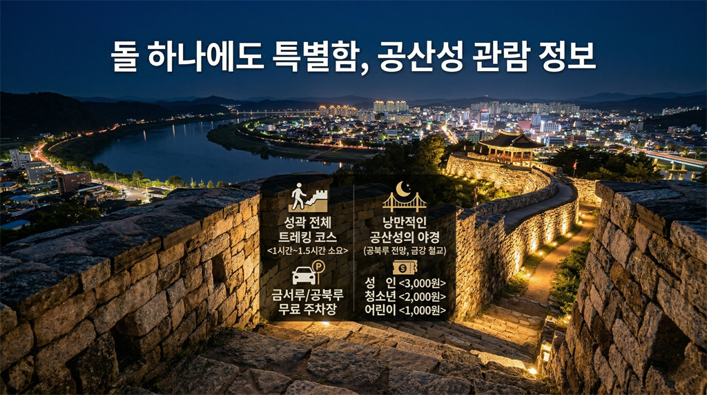 성곽에 조명이 켜지면 낮과는 전혀 다른 낭만적이고 신비로운 분위기를 자아내며, 특히 공북루에 서서 바라보는 금강 철교와 공주 시가지의 야경은 잊지 못할 장관을 연출합니다.